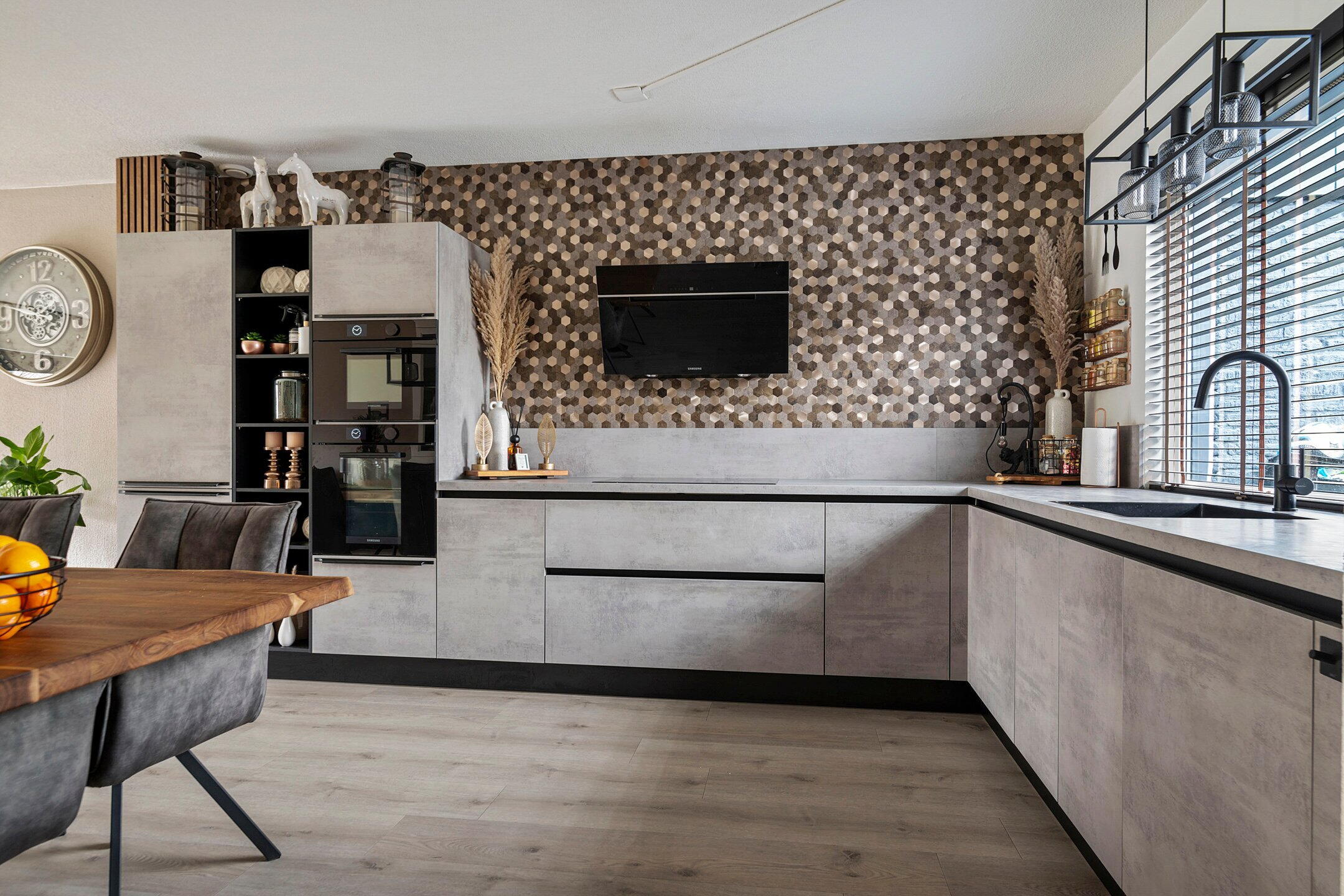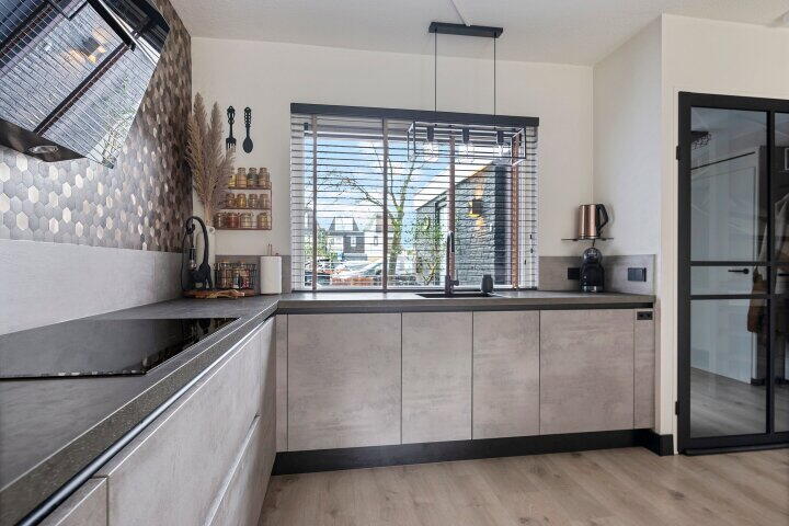 - Een hele fraaie open keuken in L-opstelling, uitgevoerd in moderne beton-look kleurstelling