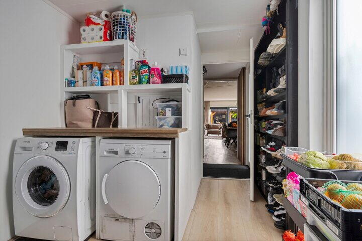 Begane grond: Entree; hal met meterkast, in moderne kleurstelling, volledig betegeld toilet met fonteintje en doorgang naar de berging en woonkamer; berging welke is voorzien van de wasmachine- en droger aansluiting en beschikt over kozijn met ventilatierooster; tuingerichte woonkamer met een grote schuifpui naar de tuin; open keuken (vernieuwd in 2021) in hoekopstelling welke is uitgevoerd in lichte kleurstelling en voorzien van de navolgende inbouwapparatuur: een inductie kookplaat, combi oven, RVS afzuigschouw, volledig geïntegreerde vaatwasser, koelkast, combi magnetron en flink wat kastruimte. De woonkamer met open keuken samen meten niet minder dan bijna 47m²!!.
