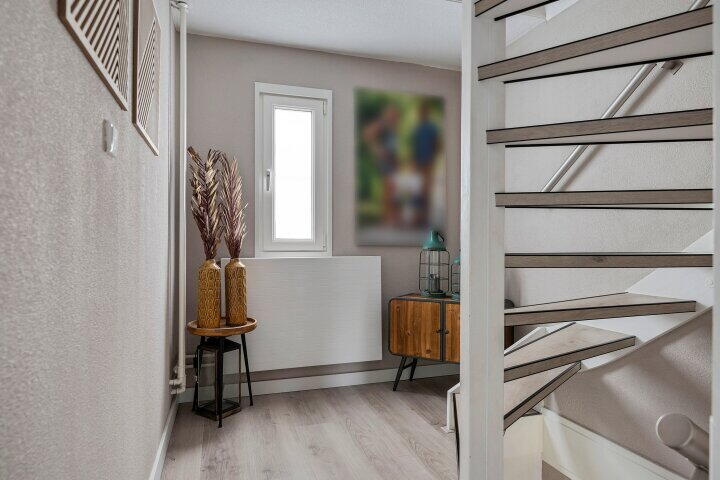 De begane grond verdieping is voorzien van een houtlook PVC vloer en hoofdzakelijk moderne convector radiatoren.