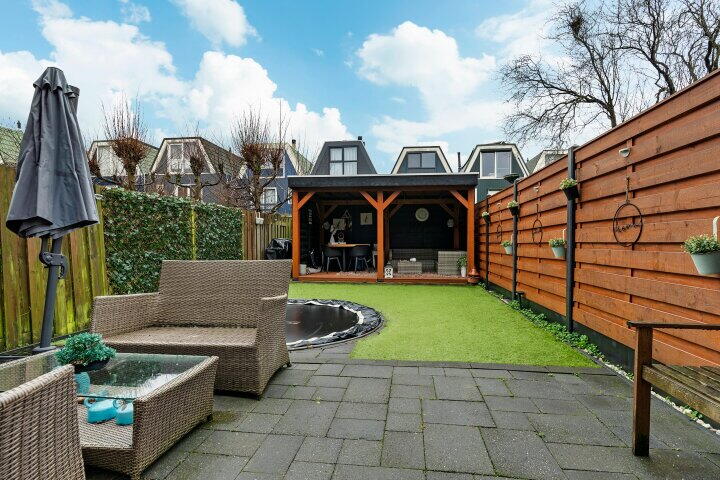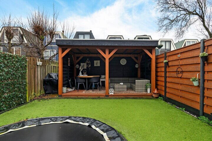Tuin: De tuin is op het zonnige westen gesitueerd en meet ongeveer 11 diep x 5,5 meter breed en is voorzien van een ruim terras bij de woning, erfafscheidingen, een "gazon" van kunstgras en een gezellige, vrijstaande houten overkapping van 4,52 x 2,61 meter.